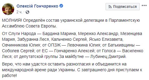 Гончаренко обнародовал состав украинской делегации в ПАСЕ