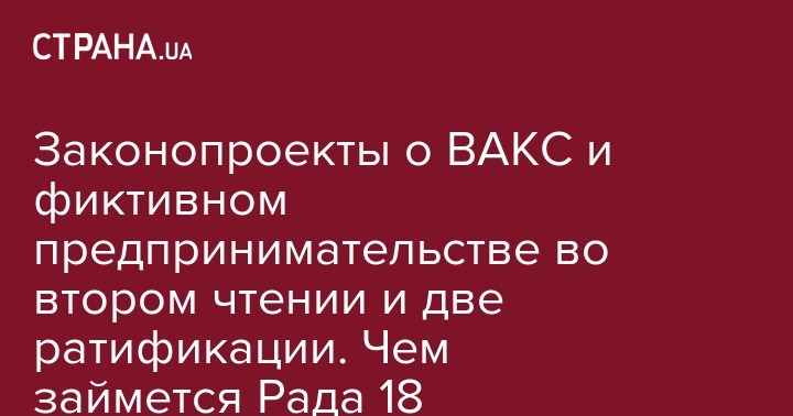 Четыре законопроекта будут рассмотрены во втором чтении: о подсудности ВАКС; о декриминализации фиктивного предпринимательства; евроинтеграционный законопроект о радиационной безопасности; законопроект о замене лицензирования видов деятельности в сфере телекоммуникации на уведомление о начале деятельности.