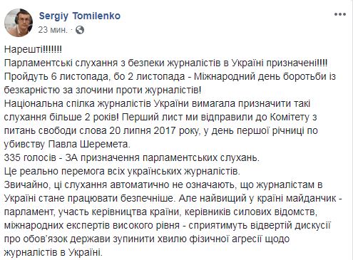 Информацию о парламентских слушаниях по безопасности журналистов подтвердил и глава Национального союза журналистов Украины (НСЖУ) Сергей Томиленко. Он написал в Facebook, что НСЖУ требовал назначить следующие слушания больше 2 лет. "Первое письмо мы отправили в Комитет по вопросам свободы слова 20 июля 2017 года, в день первой годовщины по убийству Павла Шеремета... Это реально победа всех украинских журналистов", - пишет Томиленко.