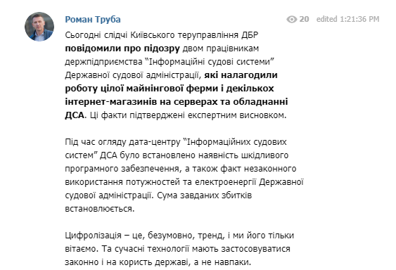 Двое сотрудников госпредприятия "Информационные судебные системы" Государственной судебной администрации (ГСА) наладили работу майнинговой фермы и нескольких интернет-магазинов на серверах и оборудовании ГСА. Об этом сообщил глава Госбюро расследований Роман Труба в своем телеграм-канале.