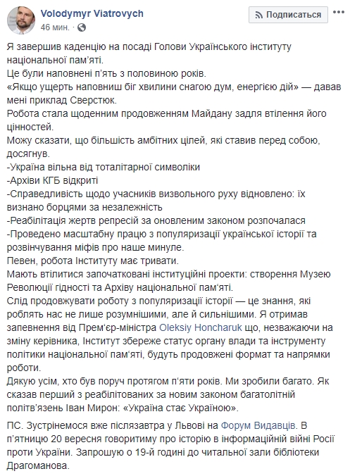 Сам Владимир Вятрович написал в Facebook, что покидает должность директора Института национальной памяти - и похвастался своими достижениями.