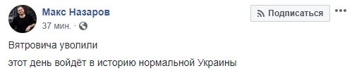 Радио- и телеведущий Макс Назаров прокомментировал это событие так: "Вятровича уволили. Этот день войдёт в историю нормальной Украины".