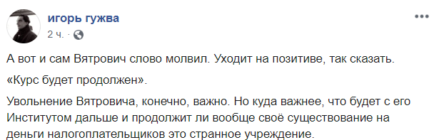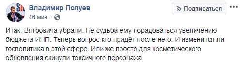 "Итак, Вятровича убрали. Не судьба ему порадоваться увеличению бюджета ИНП. Теперь вопрос кто придёт после него. И изменится ли госполитика в этой сфере. Или же просто для косметического обновления скинули токсичного персонажа".