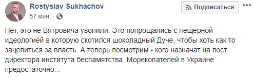 "Нет, это не Вятровича уволили. Это попрощались с пещерной идеологией в которую скотился шоколадный Дуче, чтобы хоть как то зацепиться за власть. А теперь посмотрим - кого назначат на пост директора института беспамятства.