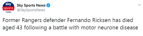 Бывший полузащитник шотландского "Рейнджерс" и сборной Голландии Фернандо Риксен ушел из жизни в возрасте 43 лет. Об этом сообщает Sky Sports News.
