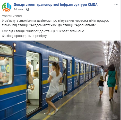 "Участок от станции "Дарница" до станции "Крещатик" проверяется специалистами", - появилось уточняющее сообщение на странице Киевского метро в Фейсбуке.