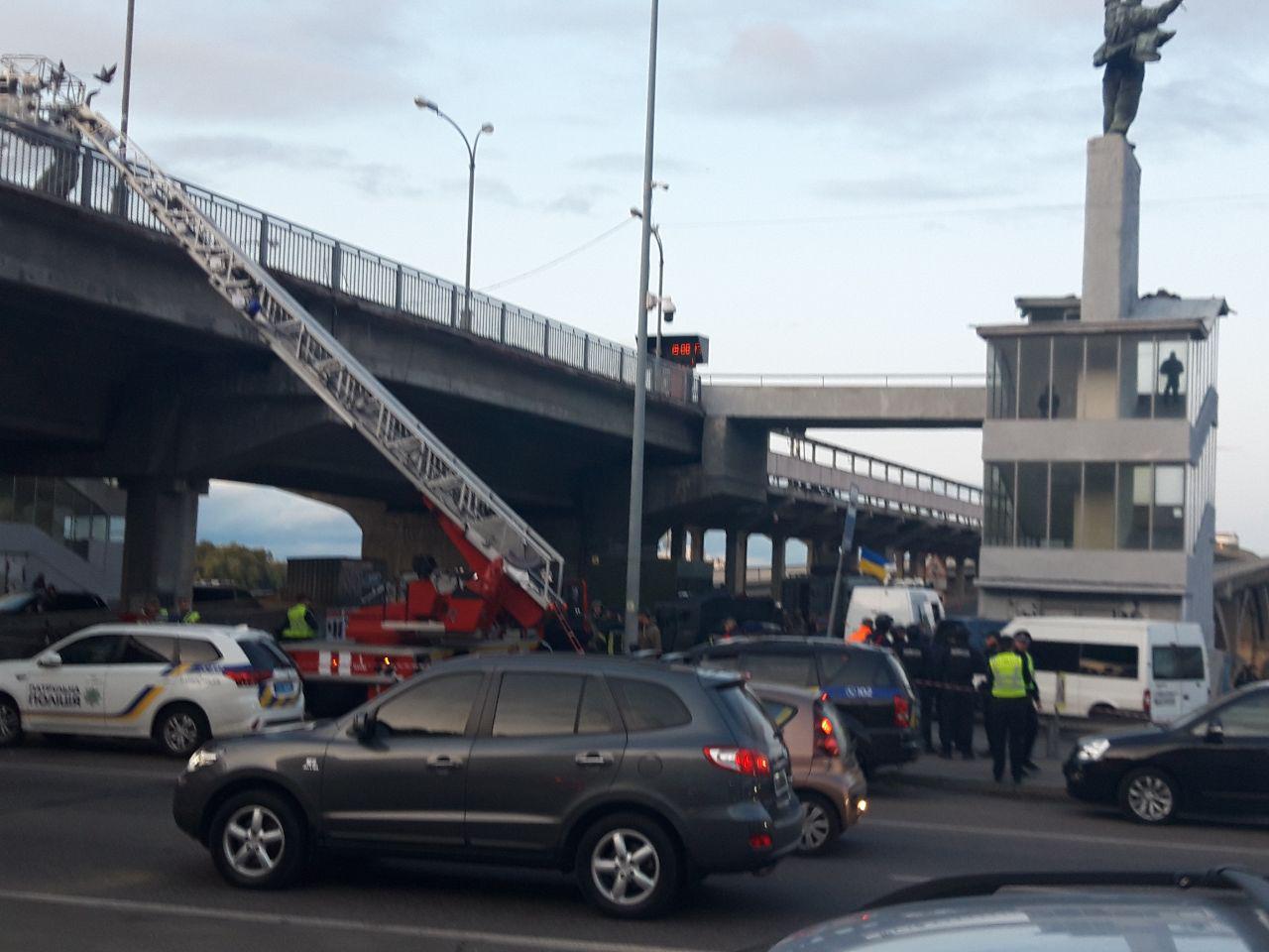 Как сообщалось ранее, в Киеве перекрыли мост Метро. Мужчина заехал на мост, остановился посреди него, вышел и угрожает его взорвать. Следователи столичной полиции квалифицируют инцидент как подготовку к террористическому акту. На мосту Метро находятся наряды патрульных, кинологи со служебными собаками, спецназ и специалисты взрывотехнической службы.