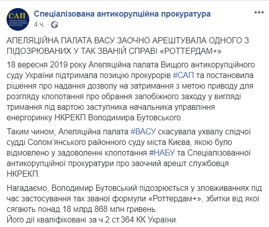 В Апелляционной палате Высшего антикоррупционного суда Украины дали разрешение на заочное задержание для привода в суд фигуранта дела "Роттердам +", экс-замначальника отдела управления энергорынка Национальной комиссии, осуществляющей регулирование в сферах энергетики и коммунальных услуг (НКРЭКУ) Владимира Бутовского.