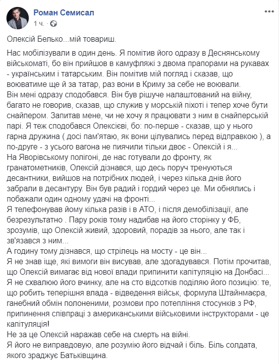 По его словам, их с Белько мобилизовали в один день. "Я заметил его сразу в Деснянском военкомате, потому что он пришел в камуфляже с двумя флагами на рукавах - украинским и татарским. Он заметил мой взгляд и сказал, что будет воевать еще и за татар, раз они в Крыму за себя не воевали", - написал он.