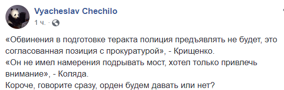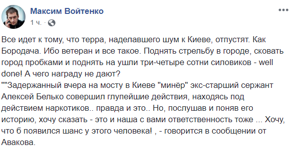 "Все идет к тому, что терра, наделавшего шум к Киеве, отпустят. Как Бородача. Ибо ветеран и все такое. Поднять стрельбу в городе, сковать город пробками и поднять на ушли три-четыре сотни силовиков - well done! А чего награду не дают?", - пишет одесский журналист Максим Войтенко.