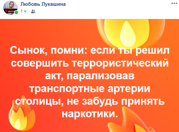 "Сынок, помни: если ты решил совершить террористический акт, парализовав транспортные артерии столицы, не забудь принять наркотики", - пишет юрист Любовь Лукашина.