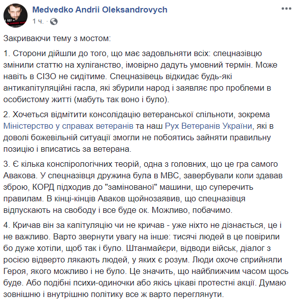 Как видно из поста, Медведько допускает и "конспирологическую" версию происходящего - постановка самого Авакова, чтобы поднять свою популярность в обществе. В ее пользу играет ряд факторов:
