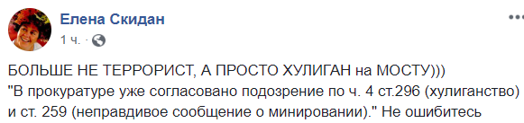 "Больше не террорист, а просто хулиган на мосту", - иронизирует журналистка Елена Скидан.