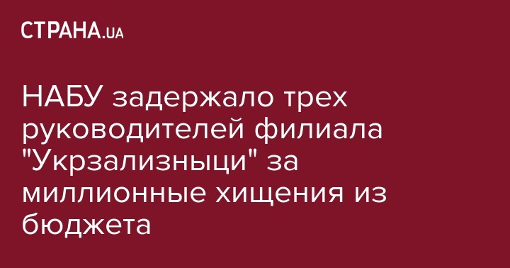 Национальное антикоррупционное бюро 12 июля отчиталось о задержании руководства ГП "Укрзализнычпостач" по подозрению в миллионных хищениях из госбюджета. Детективы НАБУ разоблачили схему, которая помогла совершить махинации на 20 млн грн в 2015 году. Об этом сообщает пресс-служба НАБУ.