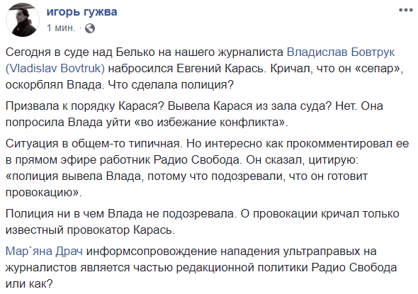 "Сегодня в суде над Белько на нашего журналиста Владислава Бовтрука набросился Евгений Карась. Кричал, что он "сепар", оскорблял Влада. Что сделала полиция?