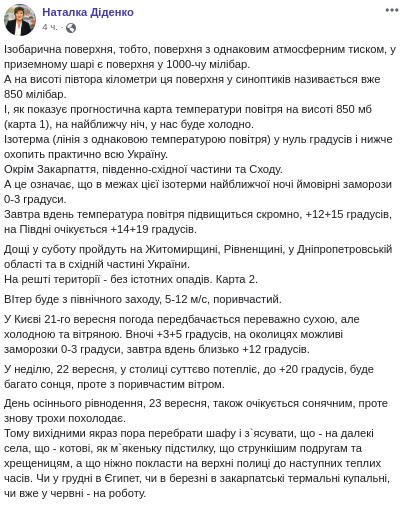 Синоптик Наталья Диденко показала рассказала, что ближайшей ночью будут заморозки до -3 градусов и пообещала, что в субботу в некоторых регионах Украины пройдут дожди. Об этом она сообщила на своей странице в Facebook.