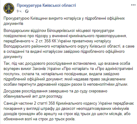 "Во время досудебного расследования установлено, что указанное лицо вопреки требованиям Законов Украины "О нотариате" и "Об административных услугах", составило, нотариально заверило и выдало заведомо поддельный официальный документ, который давал право заинтересованным лицам пересечь государственную границу вместе с несовершеннолетними детьми", - говорится в сообщении.