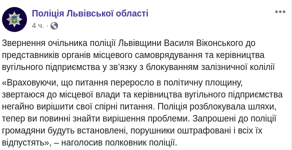 "Учитывая, что вопрос перерос в политическую плоскость, обращаюсь к местным властям и руководству угольного предприятия немедленно решить свои спорные вопросы. Полиция разблокировала пути, теперь вы должны найти решение проблемы. Приглашенные в полицию граждане будут установлены, нарушители оштрафованы и всех их отпустят", - подчеркнул начальник полиции области Василий Виконский.
