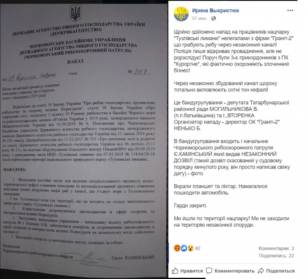 "Люди, незаконно добывающие кефаль на территории НПП "Тузловские лиманы", напали на работников нацпарка", - написала она.