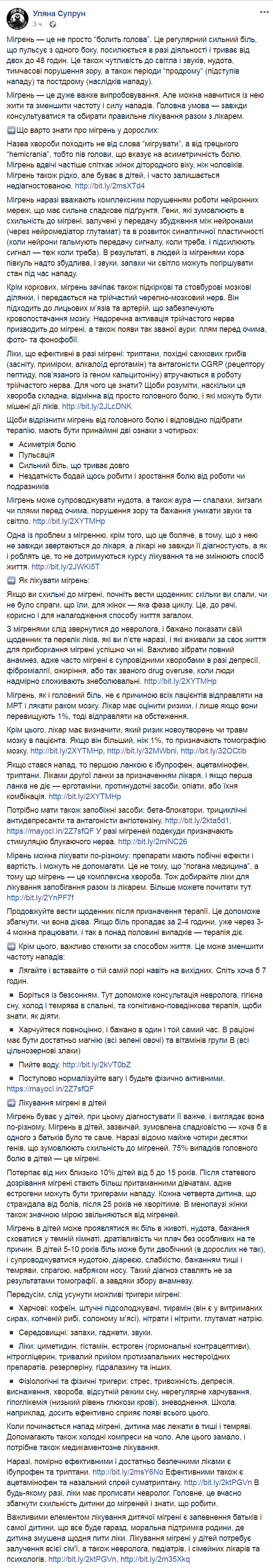 Экс-министр здравоохранения Ульяна Супрун продолжает свою просветительскую миссию в Facebook и объяснила подписчикам, как бороться с мигренью. Посвященный этому заболеванию пост она разместила на Facebook.