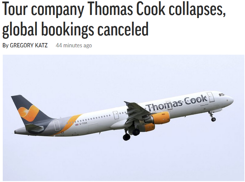 В AP статья о банкротстве вышла под громким заголовком "Коллапс туркомпании Thomas Cook, глобальные заказы отменены", скриншот: apnews.com
