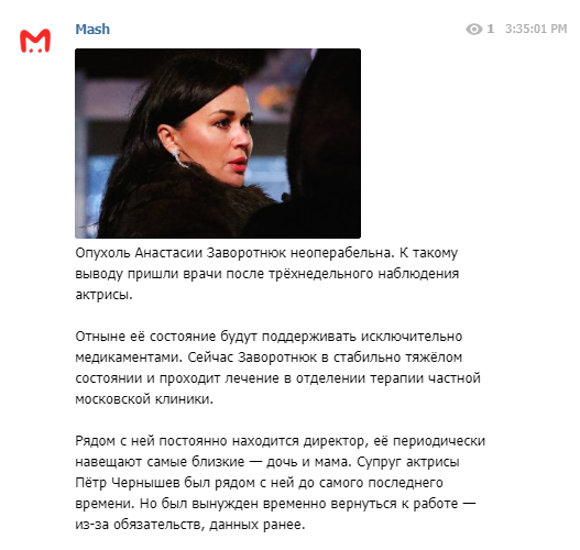 Медики признали обнаруженную у Заворотнюк опухоль неоперабельной