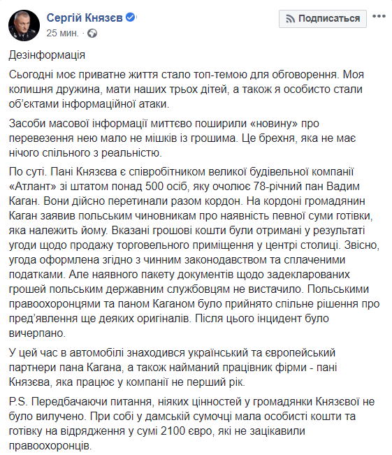 Сам глава Национальной полиции Украины Сергей Князев опроверг информацию, что его бывшая супруга Виктория пыталась провезти в Польшу незадекларированную крупную сумму евро и объяснил ее информационной атакой.