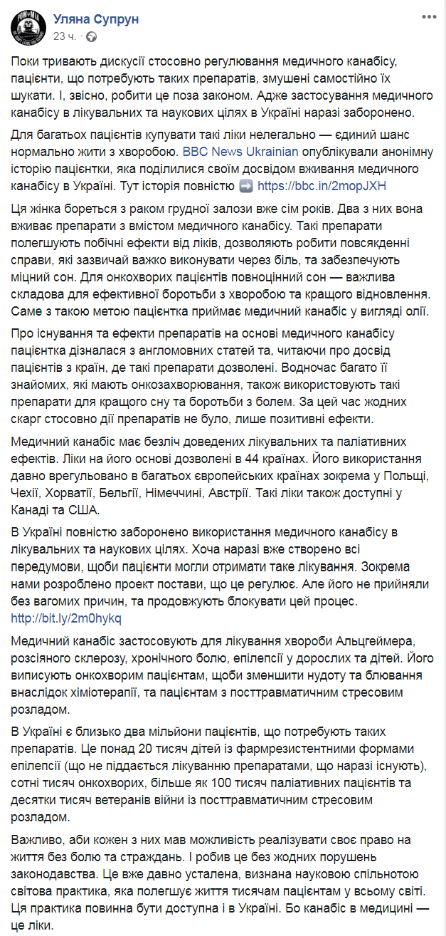 В Украине около двух миллионов пациентов нуждаются в препаратах на основе марихуаны, уверяет Супрун. В конце поста подытожила: важно, чтобы каждый из этих людей имел возможность реализовать свое право на жизнь без боли и страданий. И делал это без нарушений законодательства.