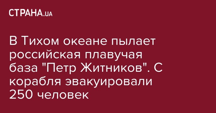 В Тихом океане пылает российский плавучий завод по переработке рыбы "Петр Житников". Пламя вспыхнуло в крабовом цехе, и в настоящее время с плавбазы уже эвакуировано 250 человек. Об этом агентству "Интерфакс" сообщили в морском спасательном подцентре (МСПЦ) "Южно-Сахалинск".
