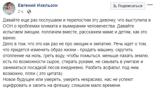 Так, журналист Евгений Ихельзон согласен с активисткой: "Давайте еще раз послушаем и перепостим эту девочку, что выступила в ООН о проблемах климата и вымирании человечества. Давайте испытаем эмоции, поплачем вместе, расскажем маме и детям, как это важно.