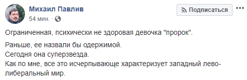 Сегодня она суперзвезда. Как по мне, все это исчерпывающе характеризует западный лево-либеральный мир", - пишет политолог Михаил Павлив.