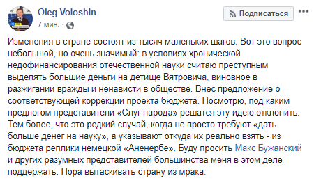 "Вот это вопрос небольшой, но очень значимый: в условиях хронической недофинансирования отечественной науки считаю преступным выделять большие деньги на детище Вятровича, виновное в разжигании вражды и ненависти в обществе. Внёс предложение о соответствующей коррекции проекта бюджета. Посмотрю, под каким предлогом представители "Слуг народа" решатся эту идею отклонить", - написал Волошин.