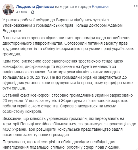 "Выразила свою обеспокоенность растущей тенденцией ксенофобии, дискриминации и вражды на почве ненависти по национальному признаку. За четыре года количество таких случаев увеличилось с 30 до 190. Не все граждане Украины обращаются в соответствующие учреждения, когда нарушаются их права, поэтому эта цифра может быть больше", - говорится в опубликованном сообщении Денисовой после ее встречи с уполномоченным по гражданским правам Польши Адамом Боднаром.