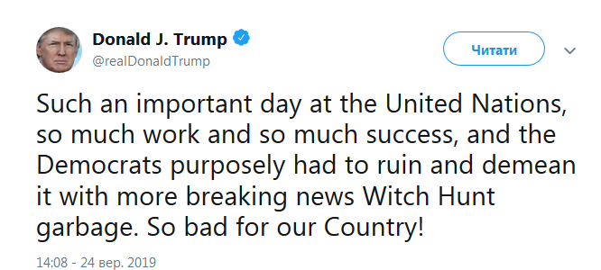 "Такой важный день в ООН, так много работы и так много успехов. А демократам надо было намеренно разрушить и унизить все этим срочным новостным мусором и охотой на ведьм. Как плохо для нашей страны!", - написал американский президент.