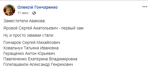 Также Сергей Яровой остался первым заместителем главы МВД. Кроме Геращенко заместителями Авакова назначены Сергей Гончаров, Татьяна Ковальчук, Екатерина Павлюченко и Александр Гогилашвили.