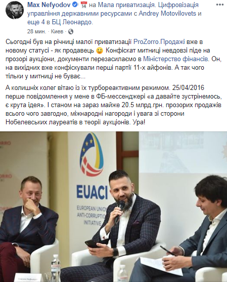 "Сегодня был на годовщине малой приватизации ProZorro уже в новом статусе - как продавец. Конфискат таможни вскоре пойдет на прозрачные аукционы, документы перешлем в Министерство финансов. Вот, на выходных уже конфисковали первые партии 11-х айфонов. А так чего только в таможне не бывает..." - написал Нефедов.