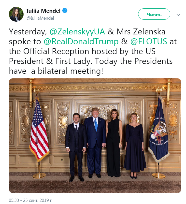24 сентября президент Украины Владимир Зеленский и его супруга Елена пообщались с президентом США Дональдом Трампом и Меланией Трамп на официальном приеме. Об этом написала пресс-секретарь главы государства Юлия Мендель в Twitter.