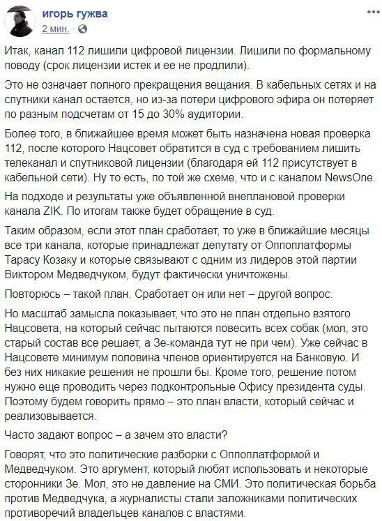 14:41 Главред "Страны" Игорь Гужва рассуждает о перспективах развития ситуации: "Итак, канал 112 лишили цифровой лицензии. Лишили по формальному поводу (срок лицензии истек и ее не продлили). Это не означает полного прекращения вещания. В кабельных сетях и на спутники канал остается, но из-за потери цифрового эфира он потеряет по разным подсчетам от 15 до 30% аудитории.