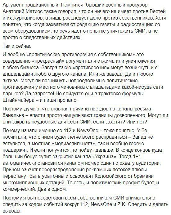Поэтому я бы посоветовал всем собственникам СМИ внимательно следить за ходом событий вокруг 112, NewsOne и ZIK. Следить и делать выводы".