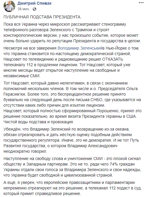 13:57 Политик и телеведущий Дмитрий Спивак назвал лишение канала 112 лицензии "публичной подставой президента": "Пока вся Украина через микроскоп рассматривают стенограмму телефонного разговора Зеленского с Трампом и строят конспирологические версии, у нас произошло событие, которое может очень больно ударить по репутации Президента и государства в целом.