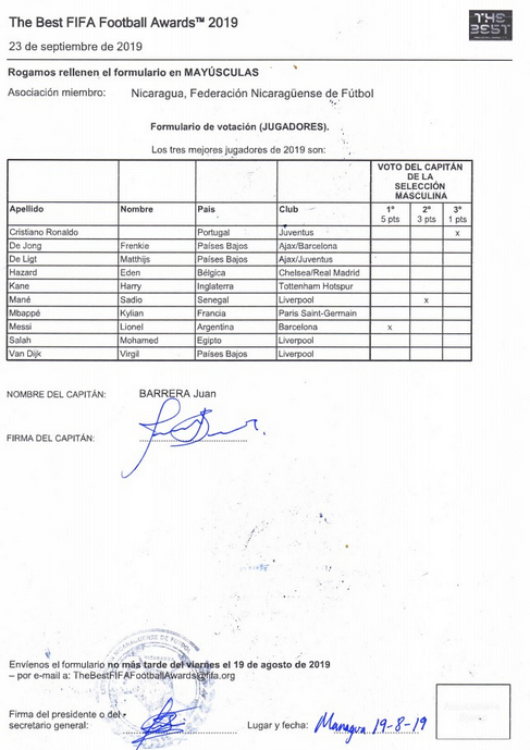Чиновники FIFA предоставили форму для голосования за подписью игрока и печатью федерации футбола Никарагуа. В тройку Барреры вошли Месси, Садьо Мане из Ливерпуля и Криштиану Роналду из Ювентуса.