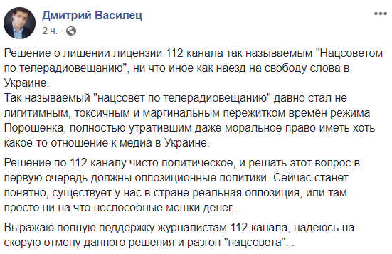 "Осуждаю решение властей о лишении цифровой лицензии телеканала 112. Плохой ход на фоне увеличивающегося за счёт новой политической команды влияния порохоботов и абсолютного бездействия власти в уголовных производствах против функционеров предыдущего политического режима", - написал он в своем Телеграм-канале.