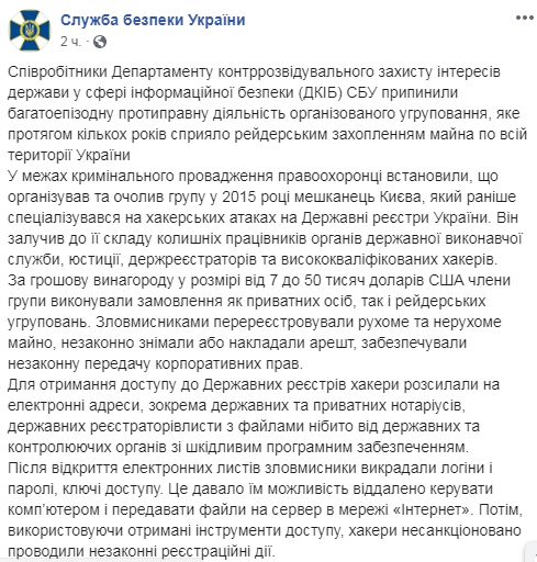 Он привлек в ее состав бывших работников органов государственной исполнительной службы, юстиции, госрегистраторов и высококвалифицированных хакеров. Участники группировки несанкционированно вмешивались в Госреестры Украины для незаконной смены собственников имущества.