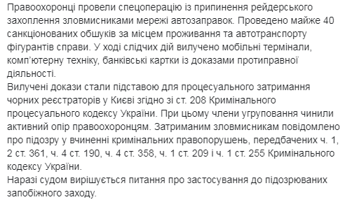 Изъятые доказательства стали основанием для процессуального задержания черных регистраторов в Киеве согласно ст. 208 Уголовного процессуального кодекса Украины. При этом члены группировки оказывали активное сопротивление правоохранителям. Задержанным злоумышленникам сообщено о подозрении в совершении уголовных правонарушений, предусмотренных ч. 1, 2 ст. 361, ч. 4 ст. 190, ч. 4 ст. 358, ч. 1 ст. 209 и ч. 1 ст. 255 Уголовного кодекса Украины.