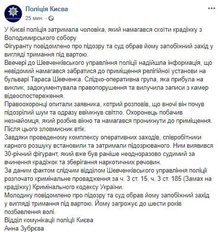 По словам охранника Владимирского собора, ночью он услышал подозрительный шум и сразу включил свет. Он увидел незнакомца, который разбил окно и пытался проникнуть в помещение. После этого злоумышленник скрылся.