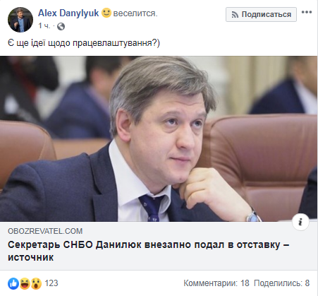 Секретарь Совета национальной безопасности и обороны Александр Данилюк иронично отреагировал на слухи о своей отставке, которые утром 27 сентября появились в СМИ. Об этом свидетельствует его пост в Facebook.