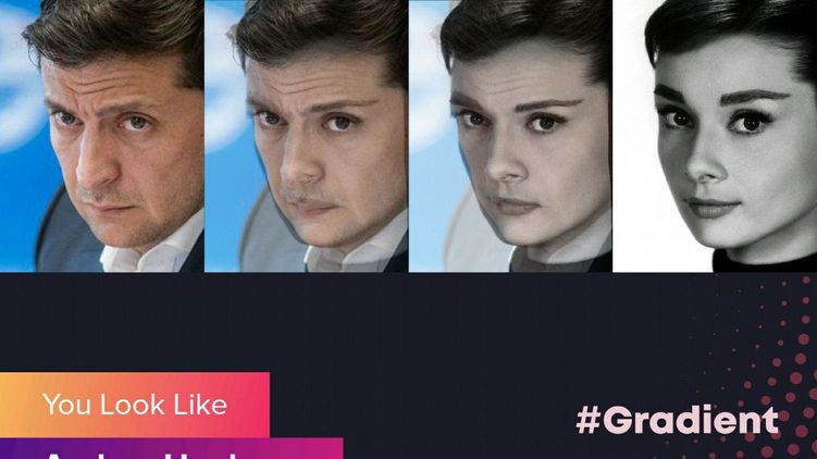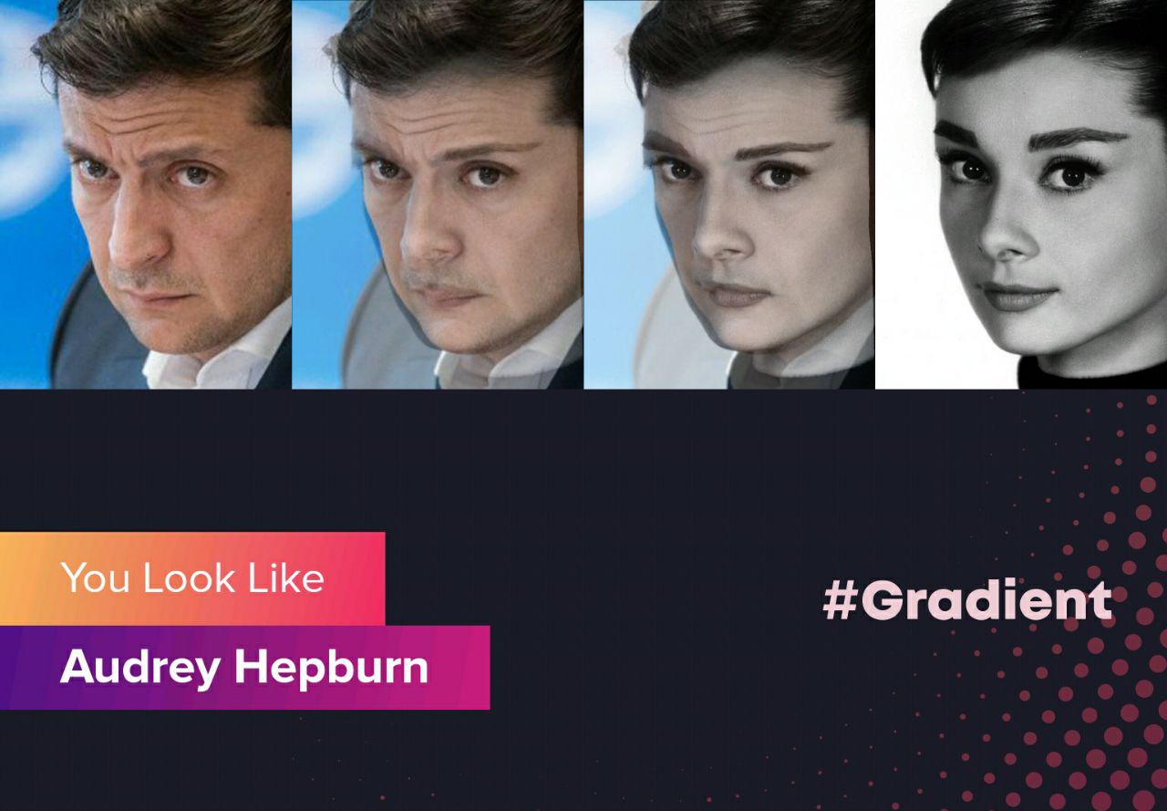 Зеленский, как считает Gradient, похож на британскую актрису и фотомодель Золотого века Голливуда - Одри Хепберн. По всей видимости, программа считала пронзительный взгляд, яркие черты лица и удачный ракурс.