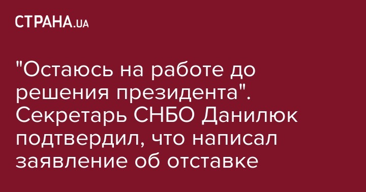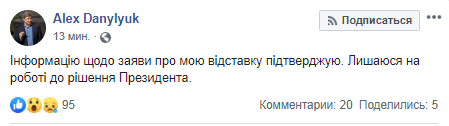 "Информацию относительно заявления про мою отставку подтверждаю. Остаюсь на работе до решения президента", - написал Данилюк.