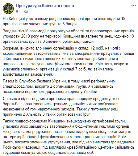 19 организованных преступных групп и 3 банды обезврежены в Киевской области в 2019 году.  Об этом сообщается на странице региональной прокуратуры.
