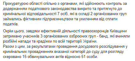"Также правоохранителями Киевской уничтожены организованные группы, участники которых занимались завладением бюджетными средствами органов местного самоуправления, незаконной добычей песка, организацией на территории области функционирования сети игорных заведений. Кроме этого, разоблачена преступная группировка, которая под руководством гражданина Российской Федерации, под видом "реабилитационных центров" занимались трудовой эксплуатацией социально уязвимых лиц", - говорится в сообщении.